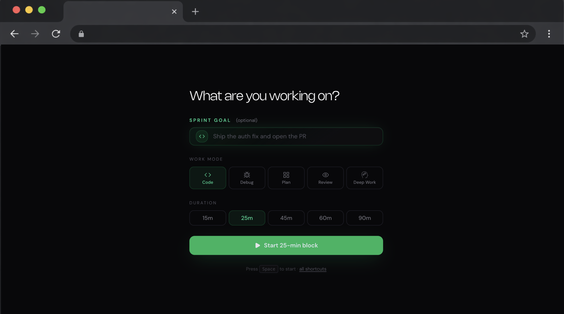 Name what you're working on first: fix the auth redirect, finish the parser tests, review PR #214. Then pick a duration and work mode. The start button echoes your commitment back: "Start 45-min block: fix auth redirect." Audio and timer launch together.