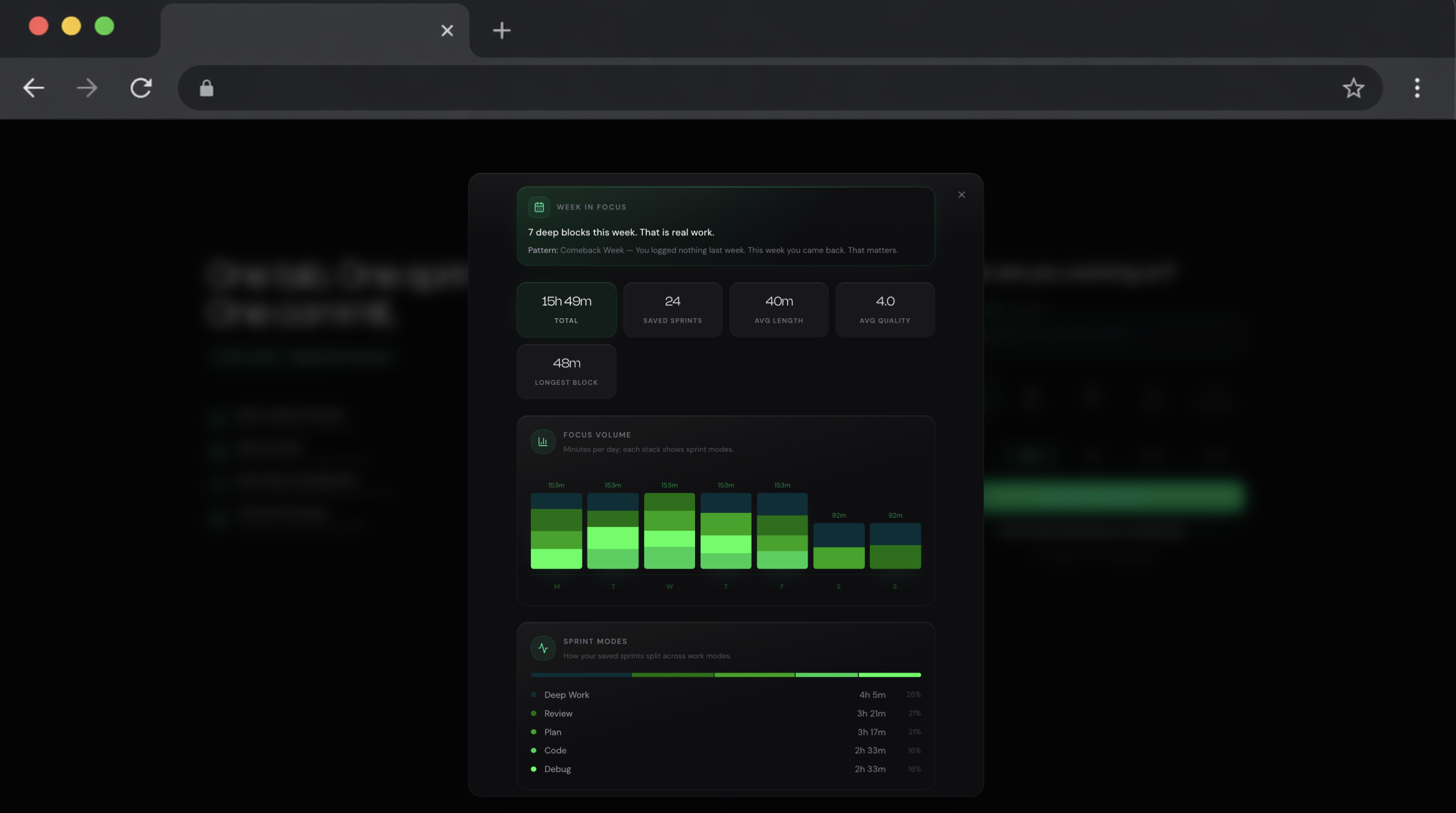 Every sprint logs quality, what landed, and your next step in 30 seconds at the end. Your weekly view shows honest focus time minus pauses, how often you hit the goal you set, and a one-sentence pattern of when you focus best.